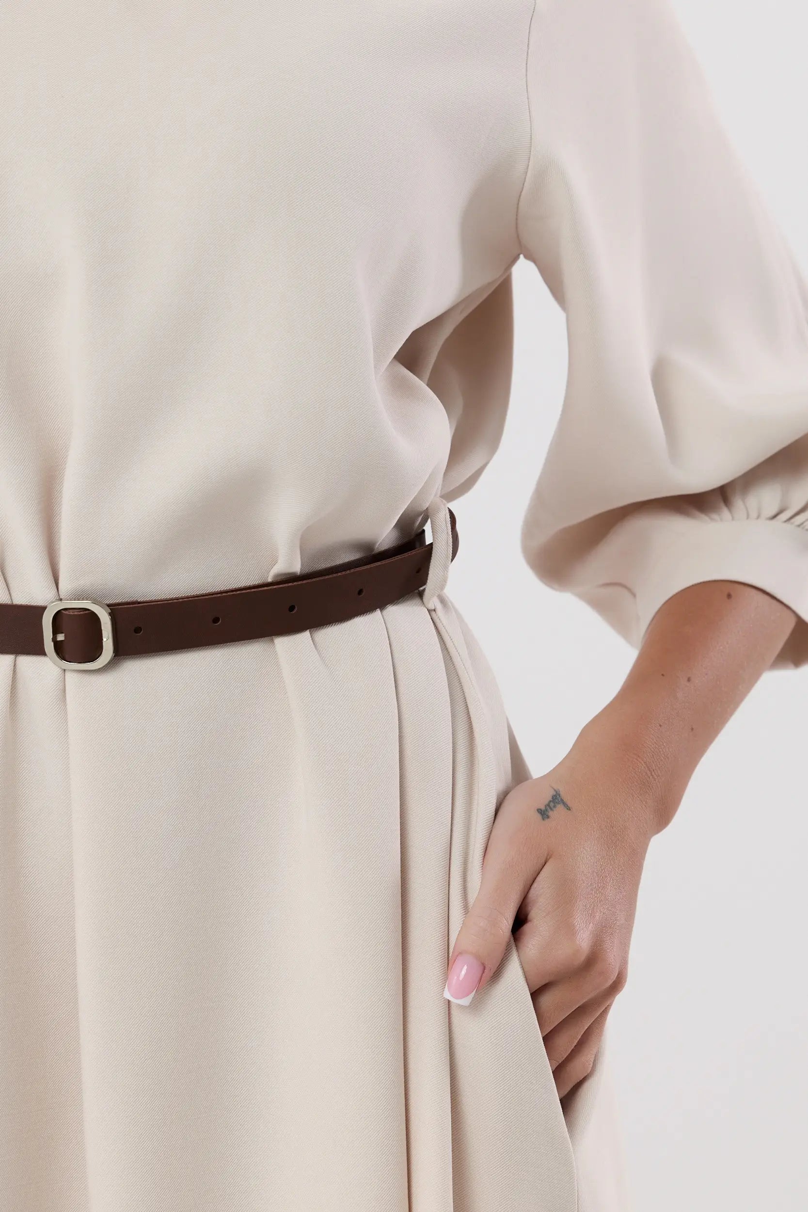 Minimalistyczny krój z klasycznym paskiem w talii – doskonale podkreśla kobiecą sylwetkę i idealnie pasuje zarówno do codziennych, biurowych stylizacji, jak i na bardziej eleganckie wyjścia.