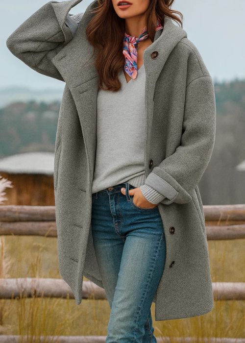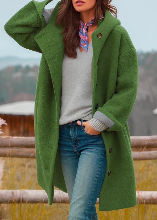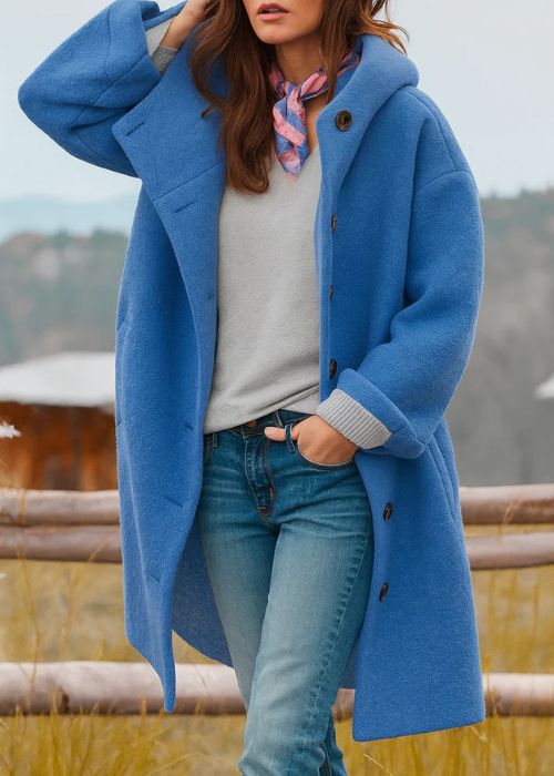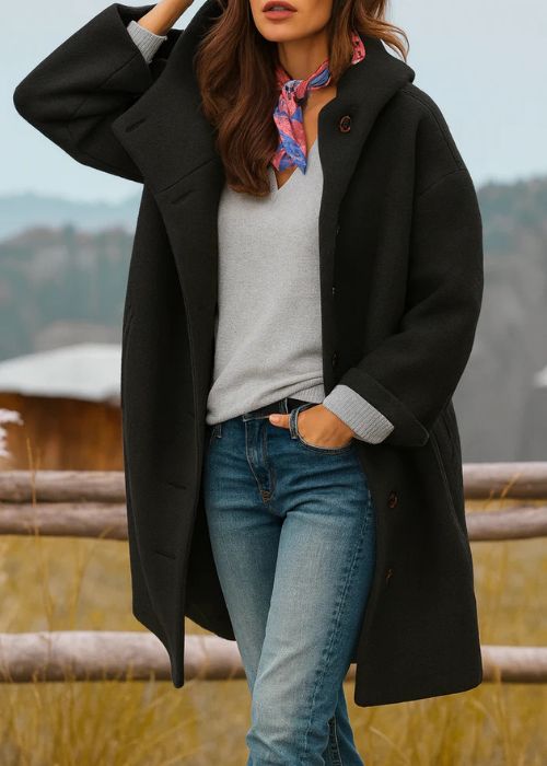 Freja to płaszcz, po który sięgasz zawsze, gdy chłód daje się we znaki. Jest lekki, ale niezwykle ciepły, o swobodnym kroju, który pięknie układa się na każdej sylwetce. Dzięki klasycznym guzikom i długości sięgającej za kolano łączy w sobie wygodę i ponadczasowy styl.