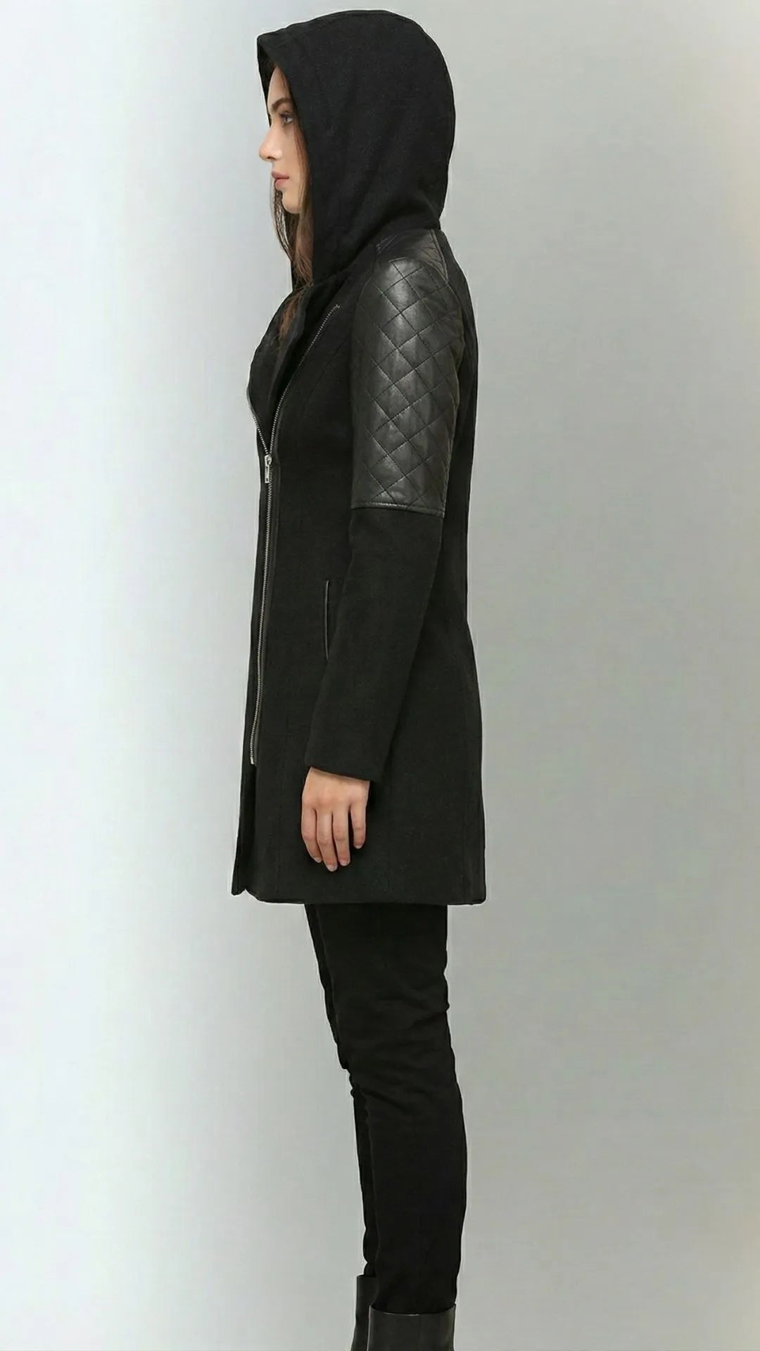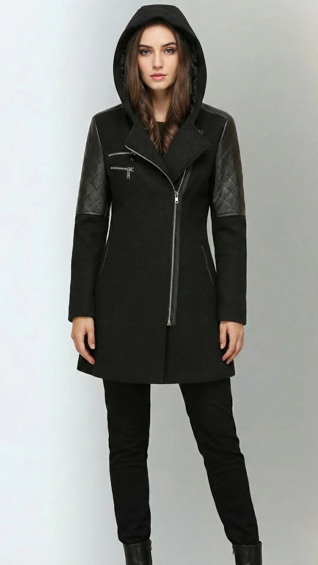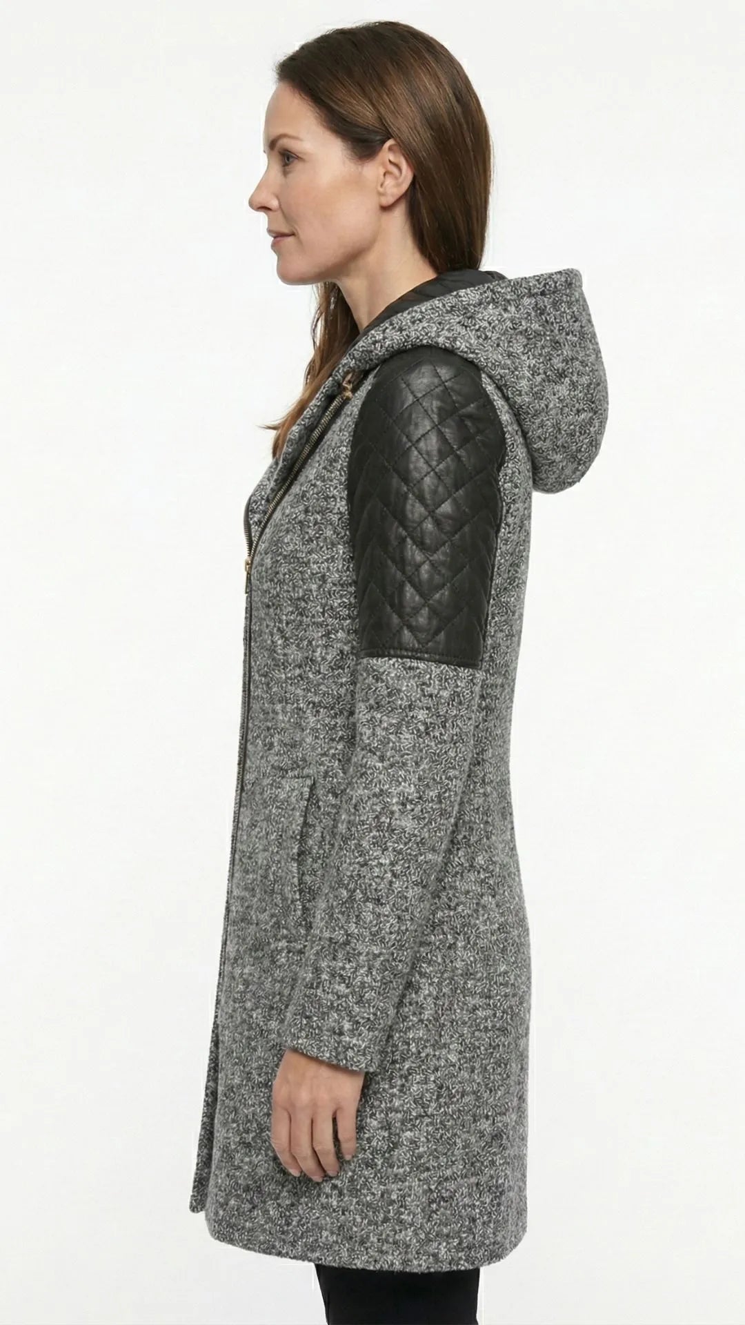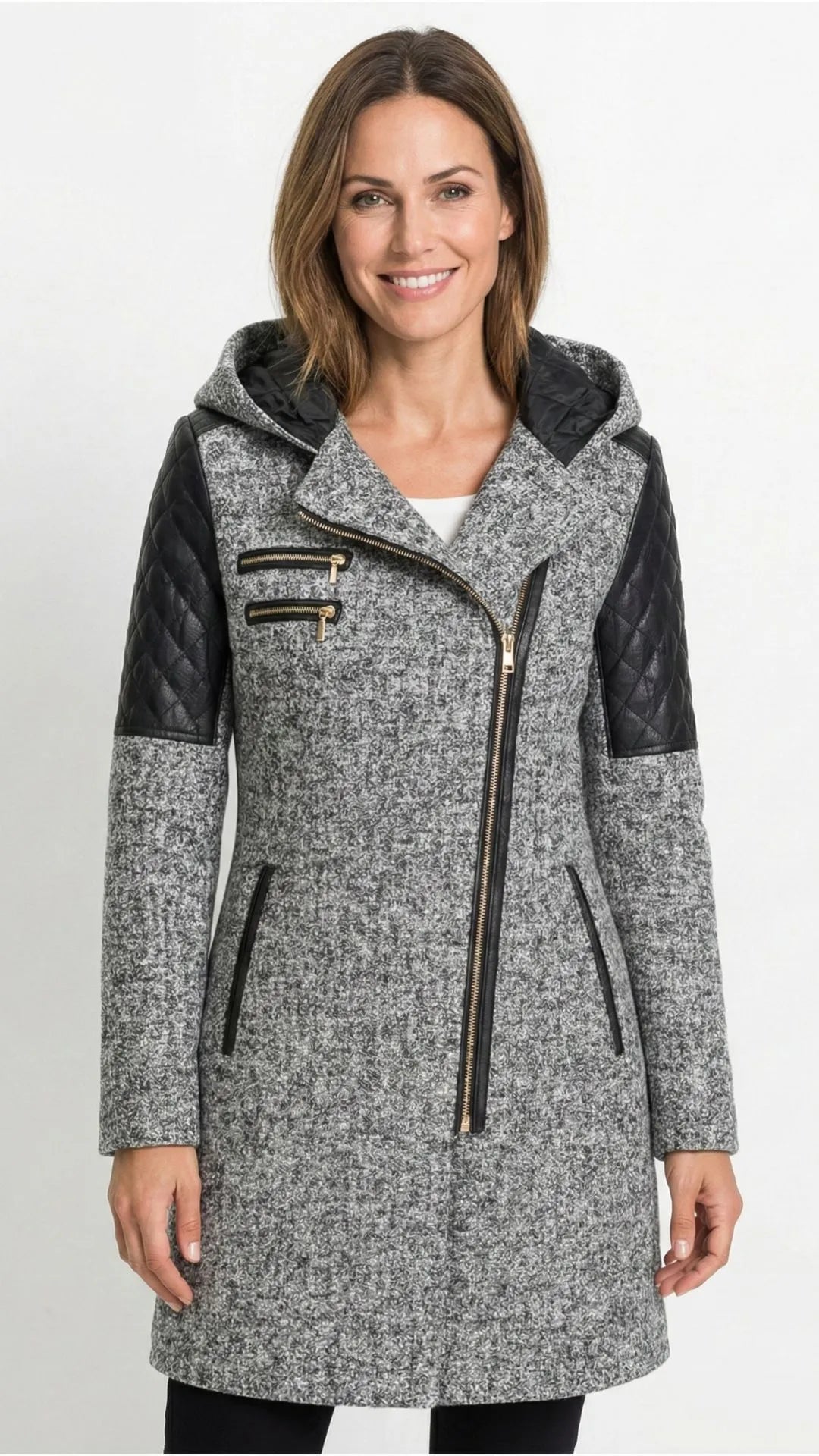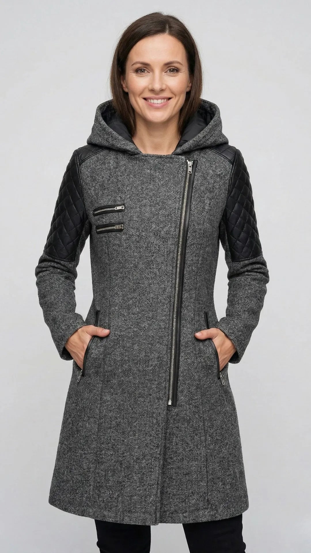 Poczuj się pewnie i stylowo tej zimy! Płaszcz Verona to coś więcej niż ochrona przed zimnem. To manifest Twojego stylu. Inspirowany kurtkami typu "ramoneska", ale w eleganckim, dłuższym wydaniu. Idealne połączenie klasycznego wyglądu tweedu z nowoczesnym akcentem skórzanych rękawów.